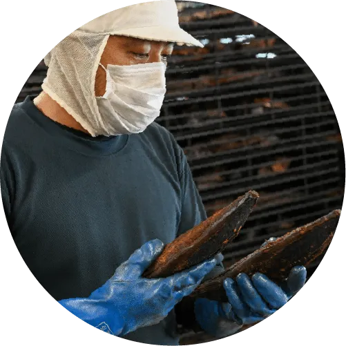 鰹を燻す工程(焙乾)と、燻した後のかつお節を寝かせる工程(あん蒸)を繰り返すことで水分を飛ばし、かつお節のうまみを濃縮しています。シマヤだしの素のうまみとコク深い味わいを担うかつお節です。