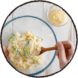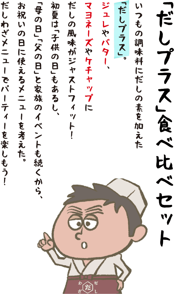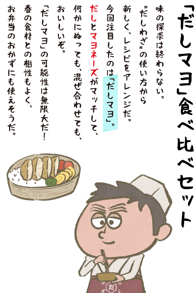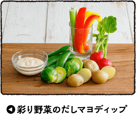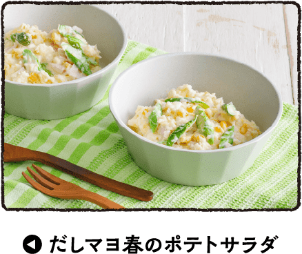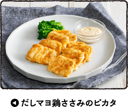 だし汁をゼラチンで 固めたのが「だしジュレ」。 お刺身はもちろん、 サラダやカルパッチョなど、 さっぱりとした清涼感の ある料理にうってつけ。 だしの上品なうま味と バターのコクが奏でる 絶妙のハーモニー。 作り置きしておけば、 いろんな料理の幅が 広がる! だしマヨから発展した 「だしオーロラソース」。 オレンジ色のソースは、 野菜との相性も抜群で 華やかに仕上がる! だしの素と炭酸水を 加えた衣で鶏ささみが ジューシーに仕上がる おいしいピカタ。 だしマヨをぬって食べると、 ハマる一品に。 身近な野菜をゆでたり、 そのまま味わう シンプルなサラダには、 だしマヨをディップとして。 だしの風味が効いて、 もっとおいしく食べられる。 家庭料理のポテトサラダも だしマヨで混ぜ合わせると 野菜が引き立つ逸品に。 だしの風味がプラスされて 味に深みがでるな!